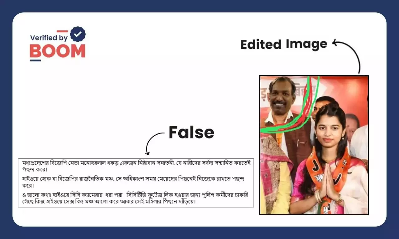 BOOM found the viral image is manipulated, with Dhakad's face being superimposed over that of Bihar BJP leader Amit Prakash.