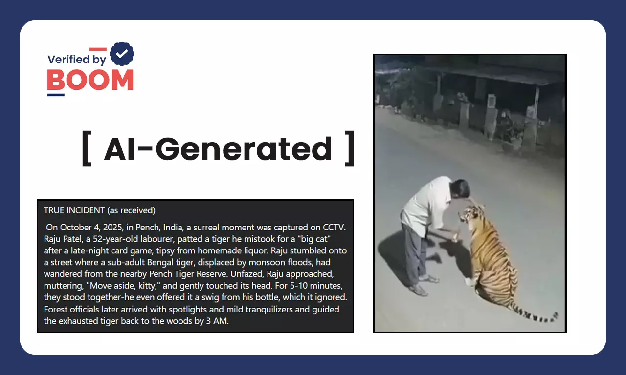 The viral video claims to show one Raju Patel from Pench, Madhya Pradesh who under the influence of homemade liquor, petted a Bengal tiger mistaking it for a cat. The caption concocts a bizarre story which says that the mysterious Raju Patel tried to make the animal drink from his bottle of alcohol and ultimately walked away unharmed. A user on X claimed that the incident happened on October 4, 2025.