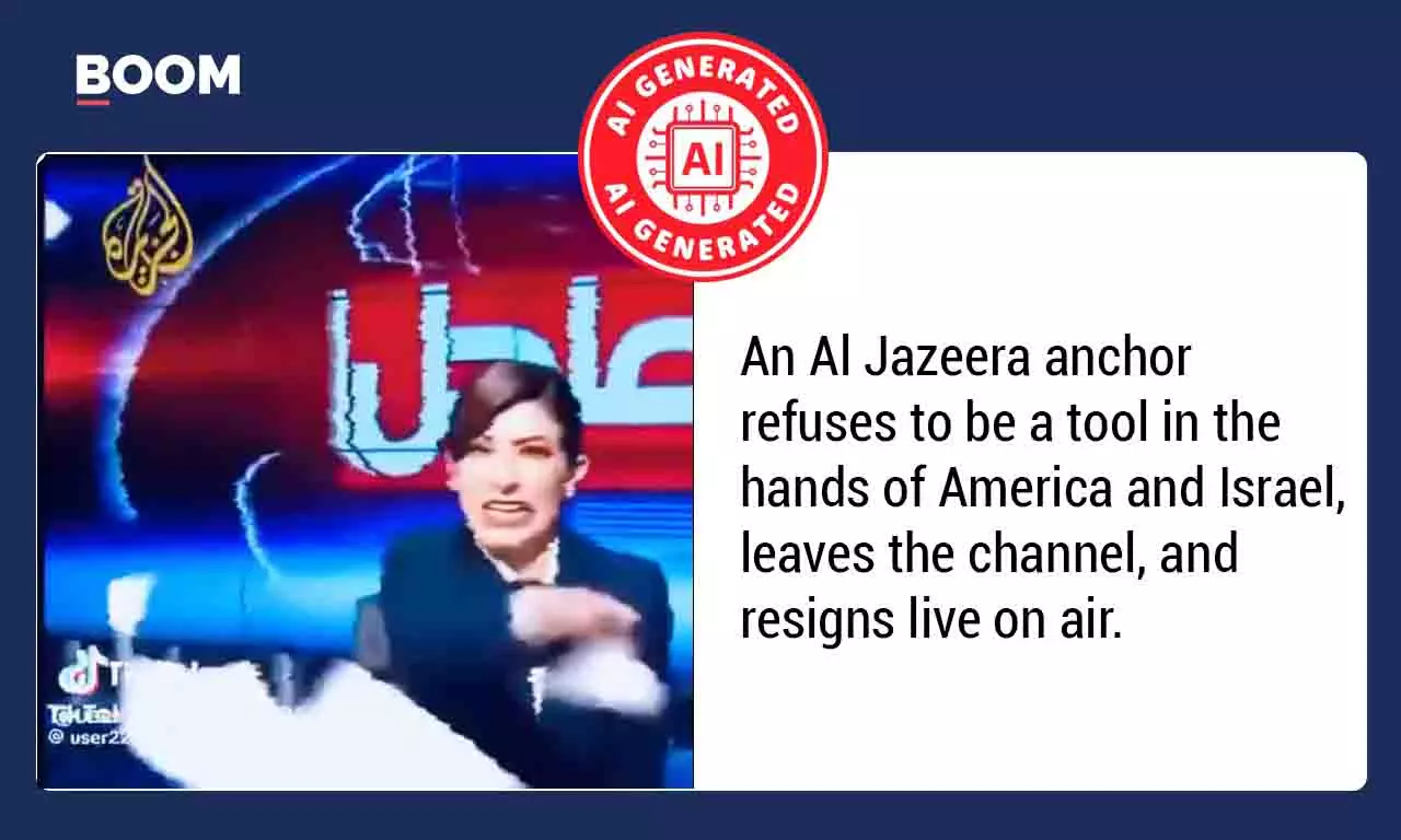BOOM found that no such resignation took place on-air at Al Jazeera, and multiple AI detection tools, along with visible artifacts, indicate that the video and audio are synthetic.