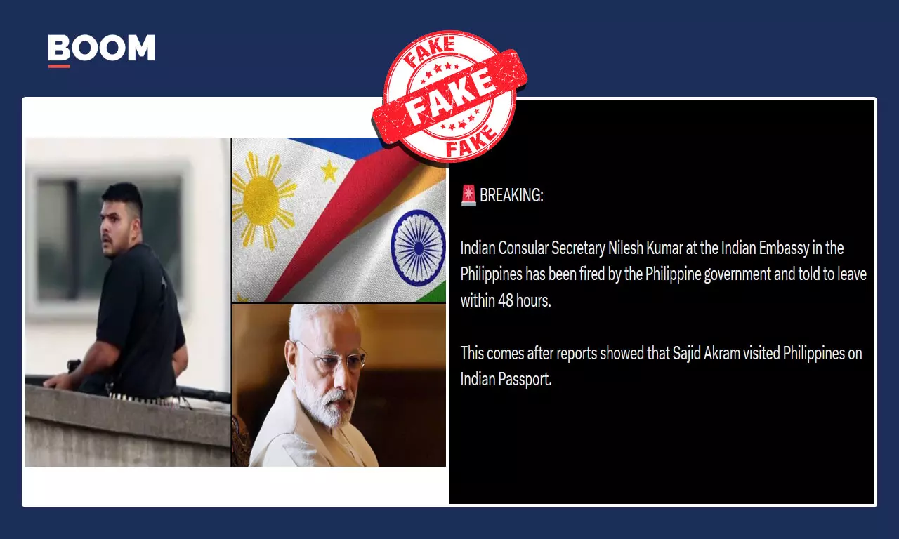 Social media posts claiming the government of Philippines has "fired" diplomat Nilesh Kumar Rai at the Indian Embassy in Manila, after news reports revealed one of the two gunman involved in the Bondi beach terror attack in Australia, travelled to the Philippines on an Indian passport, are fake.