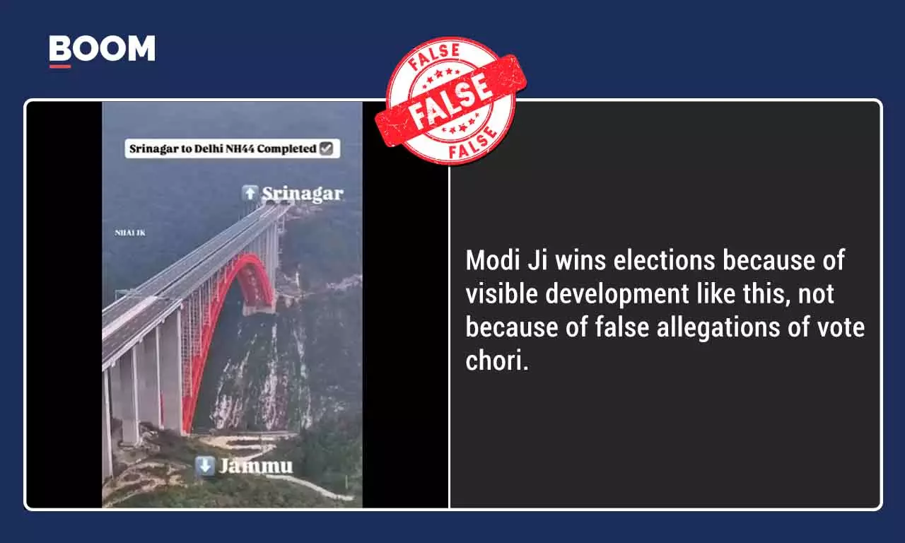 A video of a large arch bridge is being shared with a false claim that it shows India’s National Highway 44 (NH-44) connecting Srinagar and Delhi, built under the Narendra Modi–led BJP government.