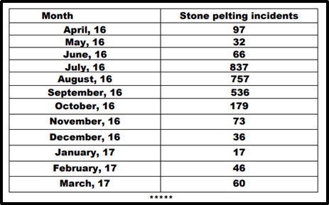 Stone pelting incidents in Kashmir Valley April 2016 to March 2017