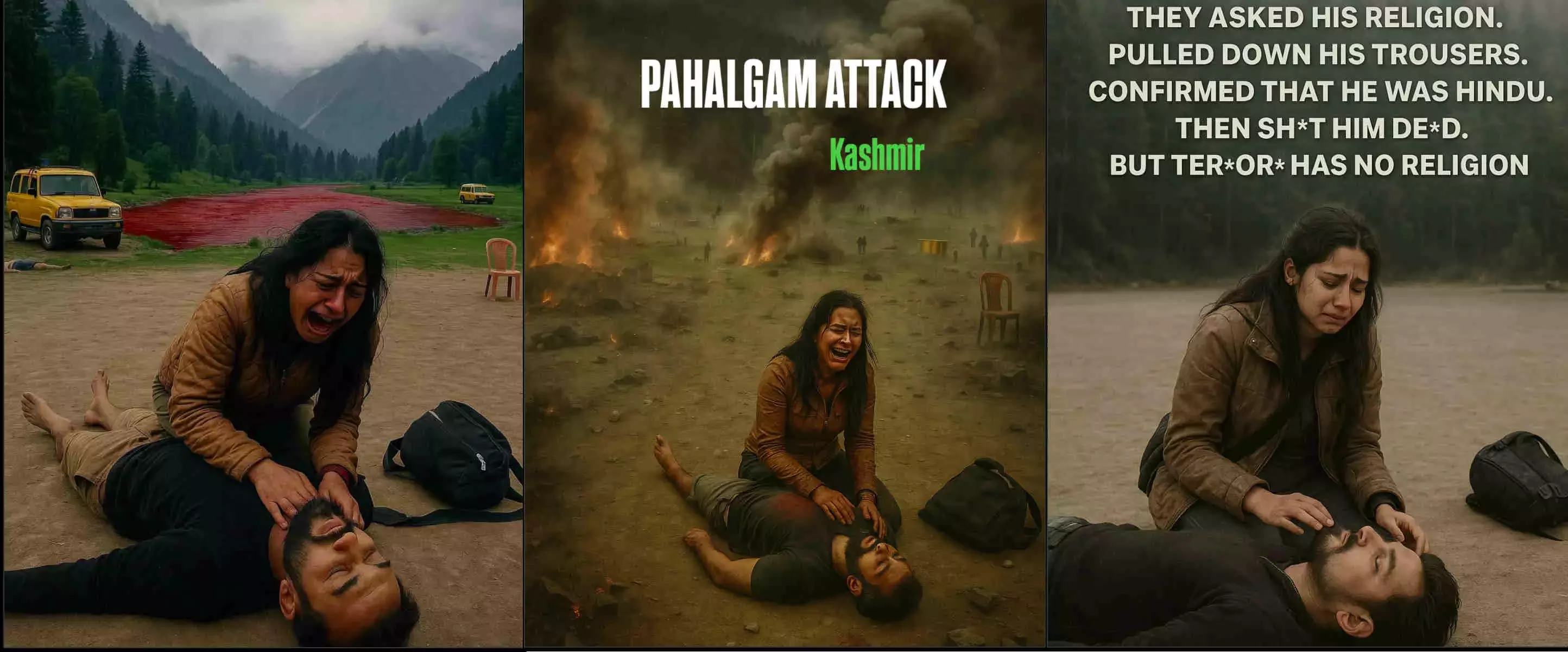 AI also contributed to the spread of misinformation around the attack. A widely shared image of Navy Lieutenant Vinay Narwal lying wounded on the ground, with his wife Himanshi sitting beside him in shock was subject to AI manipulations. Several social media users circulated realistic AI versions of the original viral photo, each adding exaggerated emotional and dramatic effects. In one fabricated image, Himanshi is seen sobbing beside her husband, with a red coloured water body behind them — suggesting a pool of blood. The caption falsely claimed the image was a real image from the attack.
