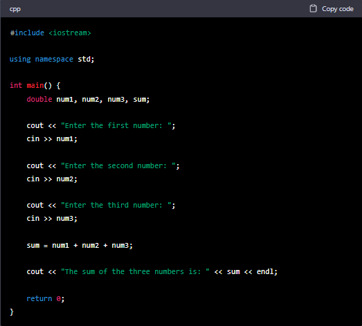 According to OpenAI, GPT-4 can write code in all major programming languages. We asked it to write a code in three different programming languages for a webpage that accepts three inputs and calculates their sum. GPT-4 was successfully able to produce the code. Not only does it generate the code, it also lets you copy it for further use.