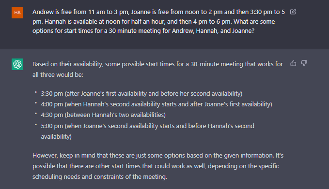 In comparison to GPT-4, Default GPT 3.5 gave four possibilities, and not a definitive solution, adding that there might be "other start times that could work as well".