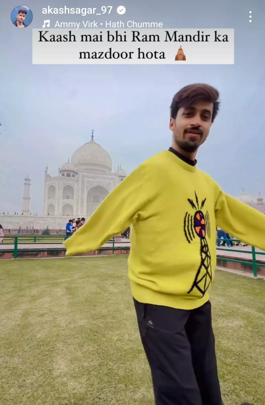 Sagar's social media content is generally not overtly religious or political, with a few exceptions. For example, during the Ram Mandir inauguration in January, he posted a reel filmed outside the Taj Mahal. In the video, he tucks his arms inside his hoodie, leaving the empty sleeves hanging.