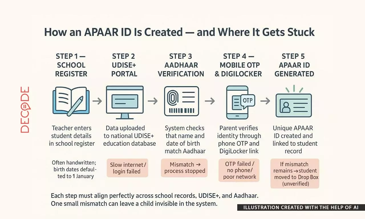 For most families, this is impossible arithmetic. Salauddin, a daily wage laborer, has three children in the same school and two phones – his and his brother's. Two children now have APAAR IDs. The third does not.