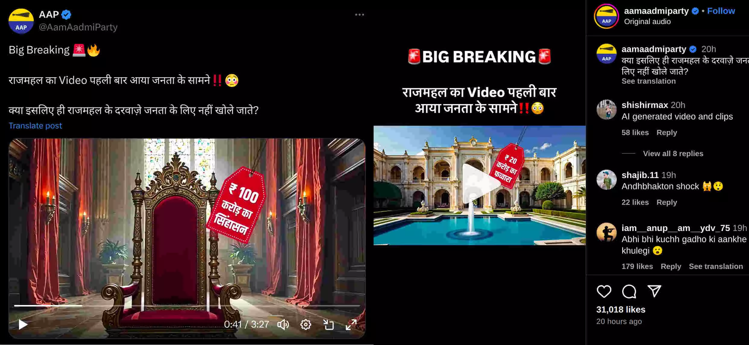 The video was shared by AAP with a Hindi caption, which translates to English as, "Big Breaking... The video of the royal palace has come before the public for the first time. Is this why the doors of the royal palace are not opened for the public?"