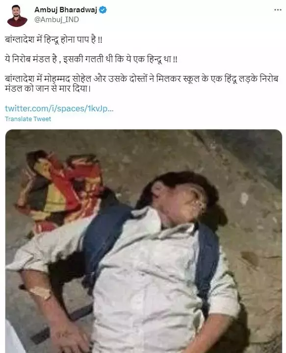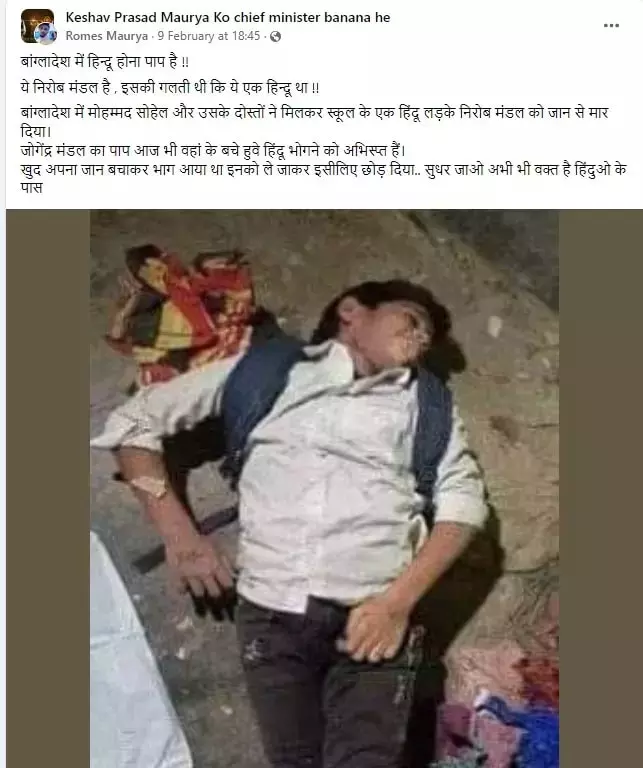 (Original Text in Hindi: बांग्लादेश में हिन्दू होना पाप है !! ये निरोब मंडल है , इसकी गलती थी कि ये एक हिन्दू था !! बांग्लादेश में मोहम्मद सोहेल और उसके दोस्तों ने मिलकर स्कूल के एक हिंदू लड़के निरोब मंडल को जान से मार दिया।)