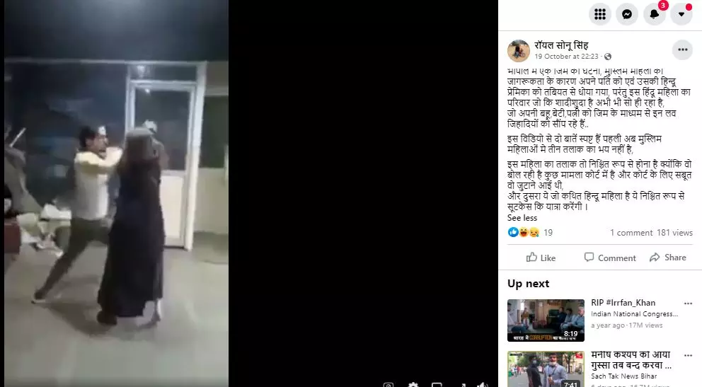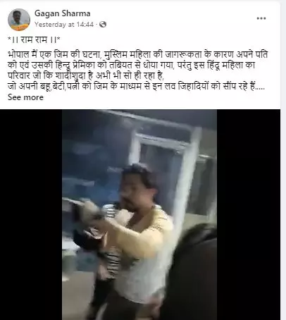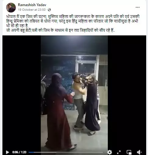 The video has been shared with a long Hindi caption which translates to 'An incident from a gym in Bhopal. A Muslim woman thrashes her husband and his Hindu lover. The family of the Hindu woman, who is married, has still not awakened and are giving their daughter-in-laws, daughters and wives to these love jihadis via gyms. The video confirms two things... first, now Muslim women are not afraid of triple talaq and second the alleged Hindu woman will surely travel in a suitcase'.