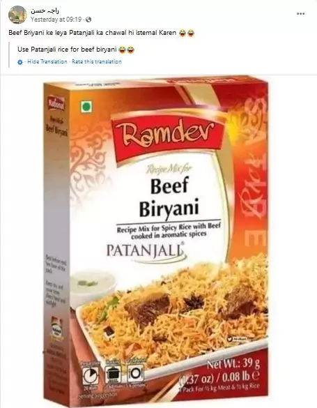 The image has been shared with Hindi caption on Facebook that reads, "Use Patanjali rice for beef biryani"