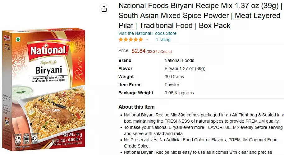 We found the original photo on e-commerce platform Amazon.com. The original product shows National Foods Biryani Recipe Mix.