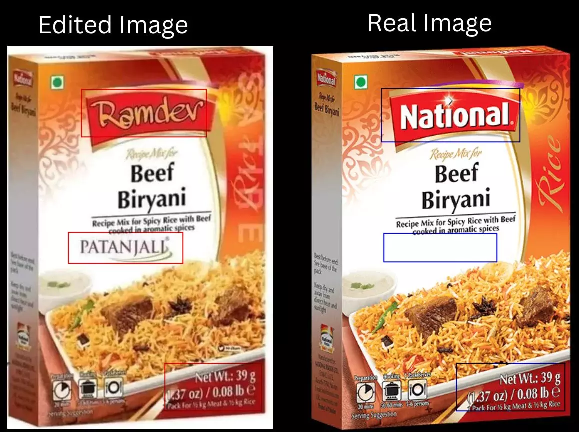 The fake photo shows the name 'Ramdev' and 'Patanjali' on the packaging and also contains the words 'beef biryani'.