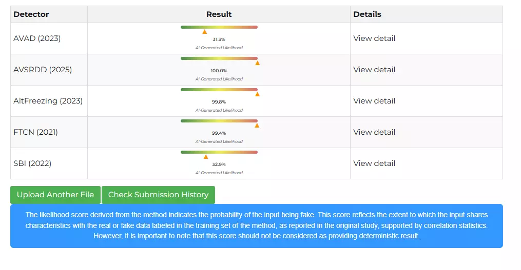 3. AI Detection Tools Test: We then ran the video on different AI detection models using Deepfake-O-Meter developed by the Media Forensics Lab at the University at Buffalo. The AI detector models analysed the video based on several parameters and found significant probability of it being AI-generated.