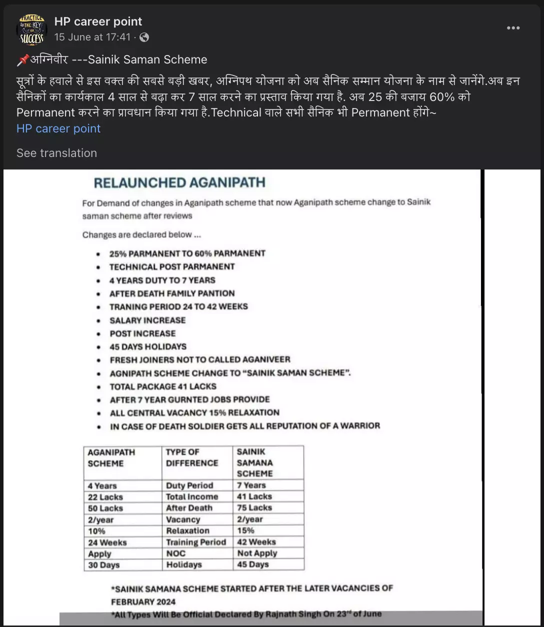 The viral document is being shared with the caption, when translated to English reads, "The biggest news of the time from sources, Agnipath Yojana will now be known as Sainik Saman Yojana. Now the tenure of these soldiers has been proposed to extend from 4 years to 7 years. Now provision has been made to permanent 60% instead of 25. All soldiers with technical will also be permanent"