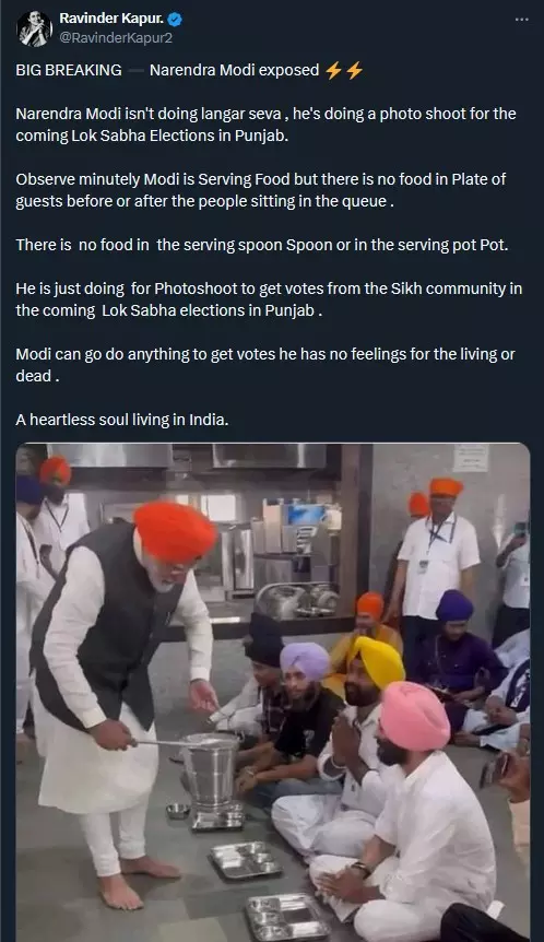 The photo was posted on X with the caption, "BIG BREAKING Narendra Modi exposed. Narendra Modi isn't doing langar seva , he's doing a photo shoot for the coming Lok Sabha Elections in Punjab. Observe minutely Modi is Serving Food but there is no food in Plate of guests before or after the people sitting in the queue .There is no food in the serving spoon Spoon or in the serving pot Pot. He is just doing for Photoshoot to get votes from the Sikh community in the coming Lok Sabha elections in Punjab . Modi can go do anything to get votes he has no feelings for the living or dead . A heartless soul living in India."