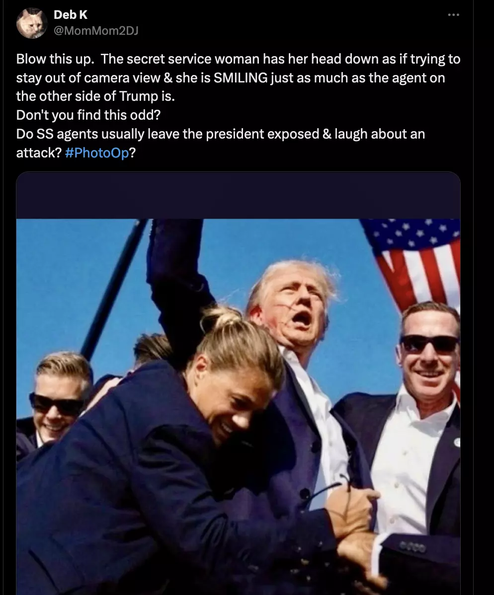 The viral photo of all three agents smiling was posted on X by the handle @MomMom2DJ with the caption, "Blow this up. The secret service woman has her head down as if trying to stay out of camera view & she is SMILING just as much as the agent on the other side of Trump is. Don't you find this odd? Do SS agents usually leave the president exposed & laugh about an attack? #PhotoOp?"
