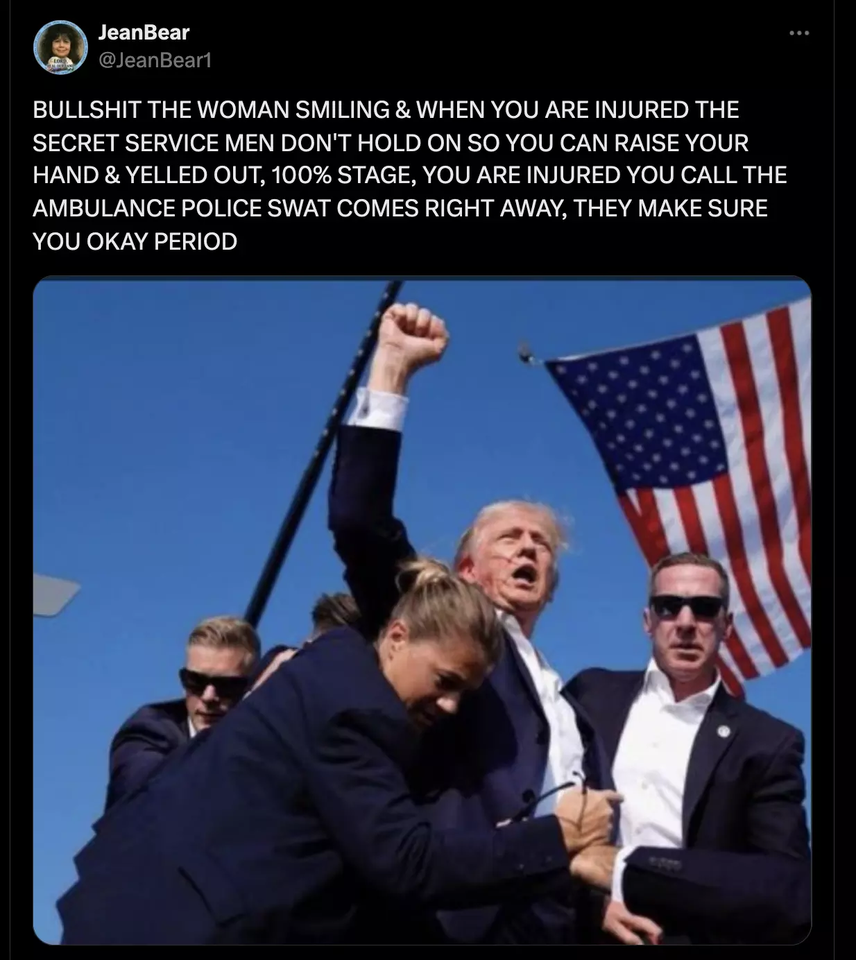 X handle @JeanBear1 posted the photo of the female Secret Service agent smiling with the caption, "B***** the woman smiling & when you are injured the secret service men don't hold on so you can raise your hand & yelled out, 100% stage, you are injured you call the ambulance police swat comes right away, they make sure you okay period."