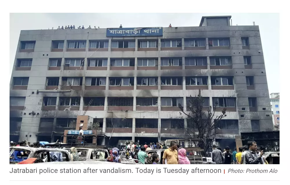 The report stated that protesters had attacked and vandalised the Jatrabari police station on August 5, 2024, and entered the police station and beat the policemen. It further said that at least seven to eight police cars were burnt in front of the police station and people were seen looting various things from the burnt cars.