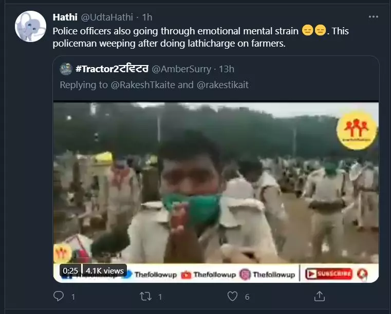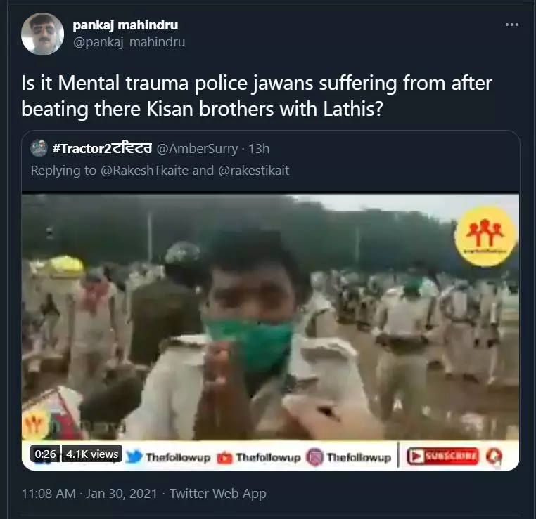 The clip is being shared with the caption, "Is it Mental trauma police jawans suffering from after beating there Kisan brothers with Lathis?"