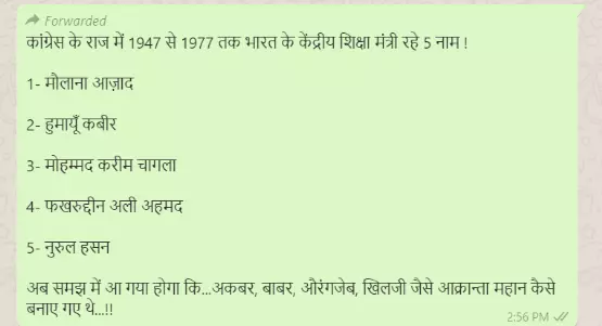 Later in December 2020 , a graphic in Hindi was also viral , which listed five Muslim education ministers between 1947 to 1977. The narrative claimed that the ministers including Maulana Azad, Humayun Kabir, Mohammed Carim Chagla, Fakruddin Ali Ahmed and Nurul Hasan were responsible for portraying rulers like Akbar, Babur, Aurangzeb, Khilji as great.