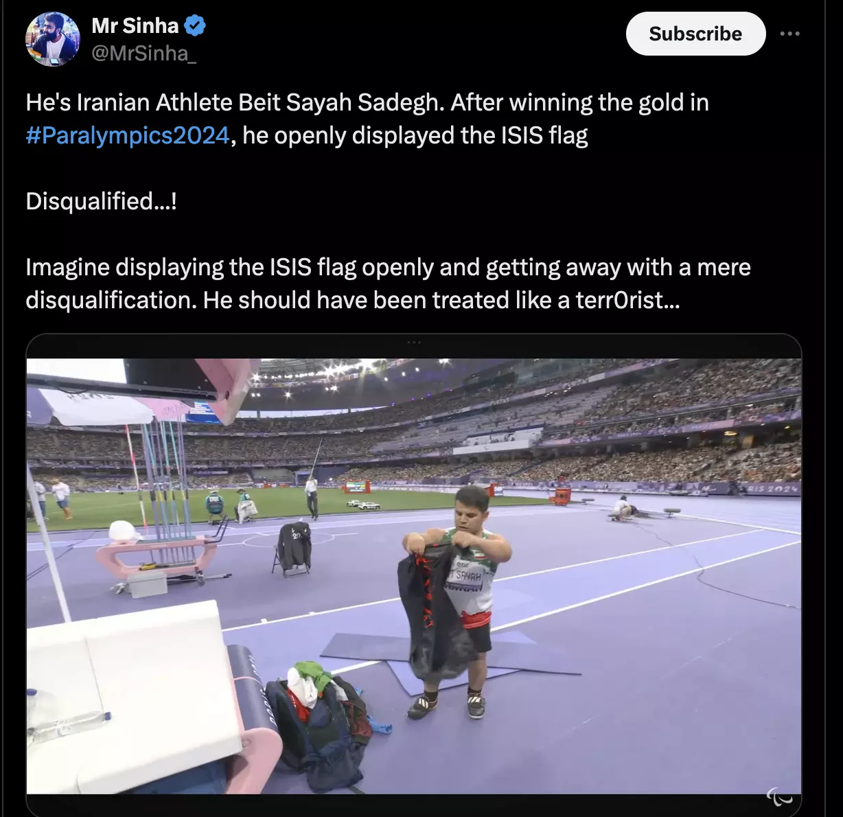 Several social media users including fake news peddler Mr Sinha (@MrSinha_) posted the viral photo with the caption, "He's Iranian Athlete Beit Sayah Sadegh. After winning the gold in #Paralympics2024, he openly displayed the ISIS flag Disqualified...Imagine displaying the ISIS flag openly and getting away with a mere disqualification. He should have been treated like a terr0rist.)