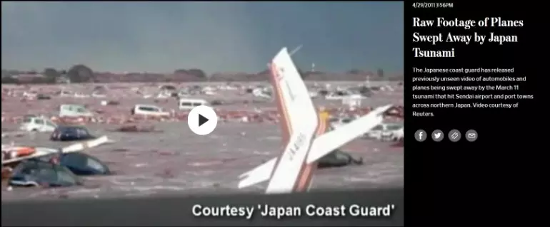 Taking cue from the video, we did a keyword search and found a Wall Street Journal news article published on April 29, 2011. The article features the same viral video with the headline, "Raw Footage of Planes Swept Away by Japan Tsunami". The WSJ article states that Japanese Coast Guard uploaded the video when the tsunami hit the Sendai Airport in Japan on March 11, 2011.