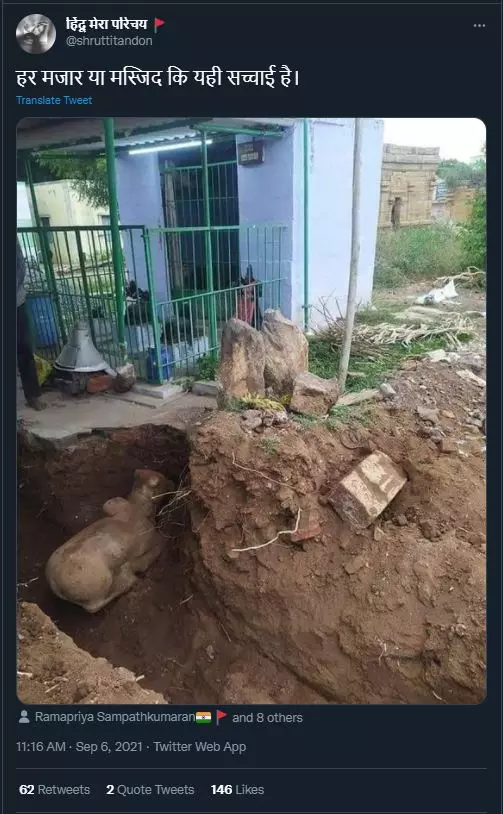 A photo of an idol of a Hindu deity Nandi found buried under the ground near a temple compound in Namakkal district, Tamil Nadu is being shared with the false claim that it was discovered while digging under a mosque.