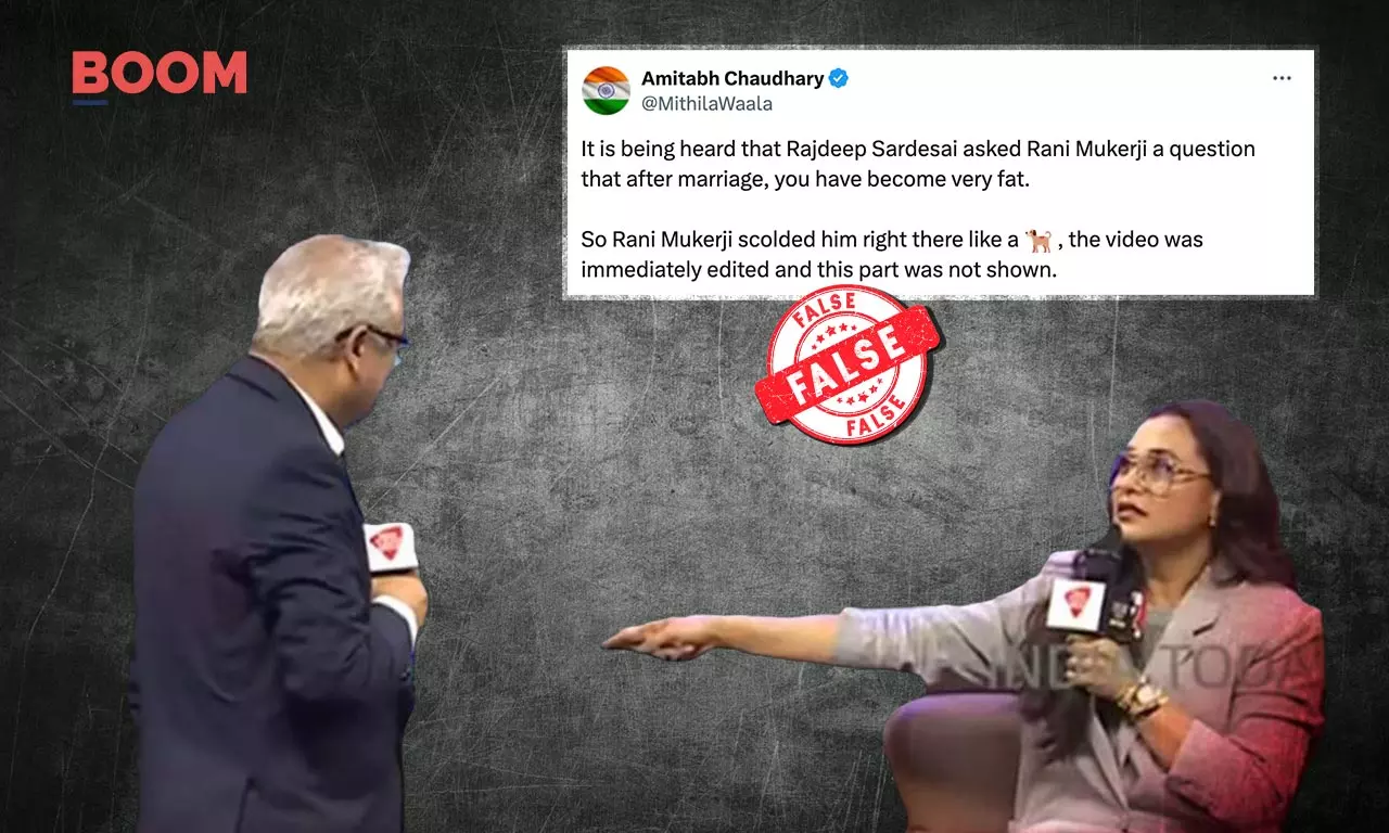 A cropped video showing Bollywood actress Rani Mukerji sternly telling India Today anchor Rajdeep Sardesai to sit down is being shared on social media with the false claim that she was reacting to a sexist remark about her weight.