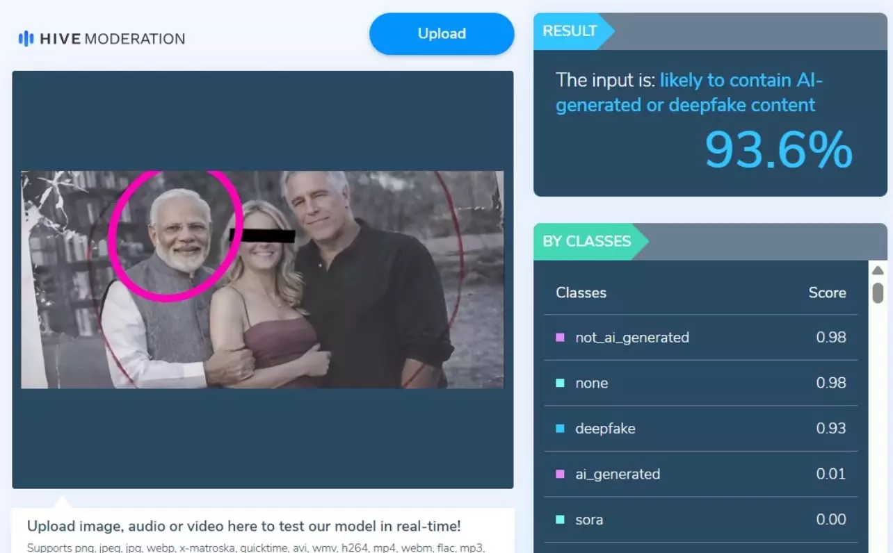 Hive Moderation classified the Sonia Gandhi image as 100% AI-generated and the Modi-Epstein image with a 93.6% probability of AI/deepfake content, while the Rahul Gandhi image was classified as 100% AI-generated by the AI vs Human Image Detector.