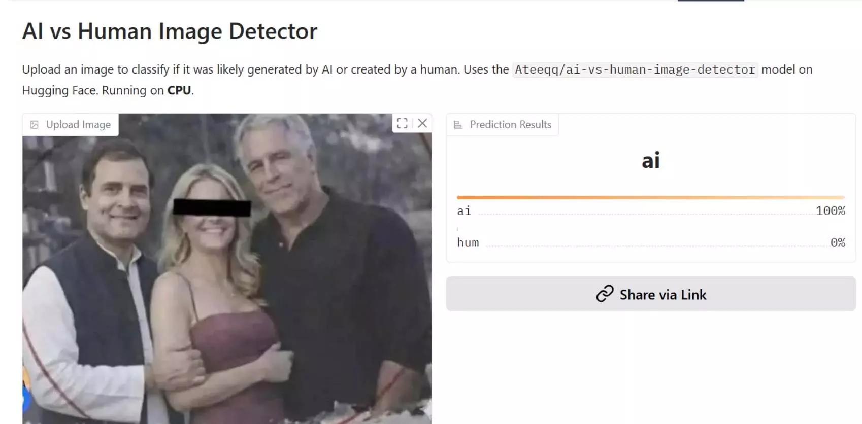 After a new batch of Jeffrey Epstein related documents were released by the United States Justice Department, a series of AI-generated photos are being shared on social media falsely claiming to show Prime Minister Narendra Modi, and Congress leaders Rahul Gandhi and Sonia Gandhi posing with the late convicted sex offender.