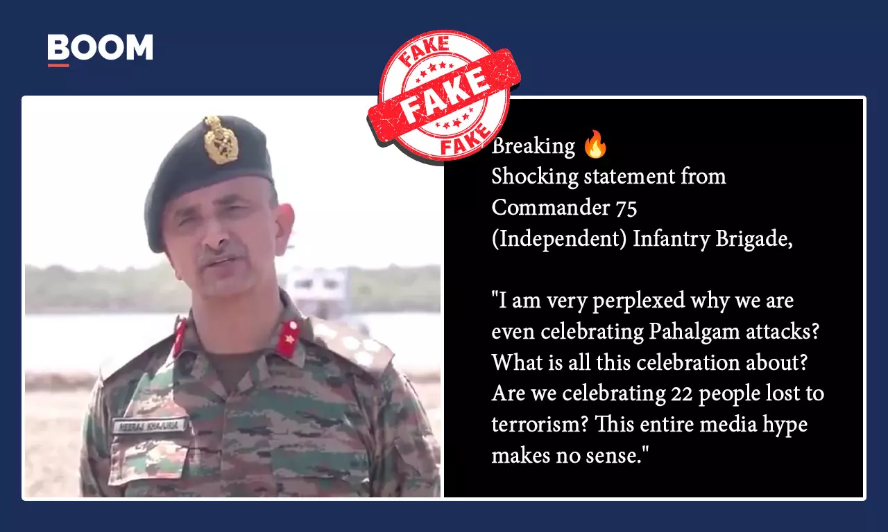 We found the original video from April 22, 2026, in which Brigadier Neeraj Khajuria spoke about Operation Sindoor and how the army foiled enemy drone threats in the Rann sector. He made no remarks against the government or the Pahalgam attack.