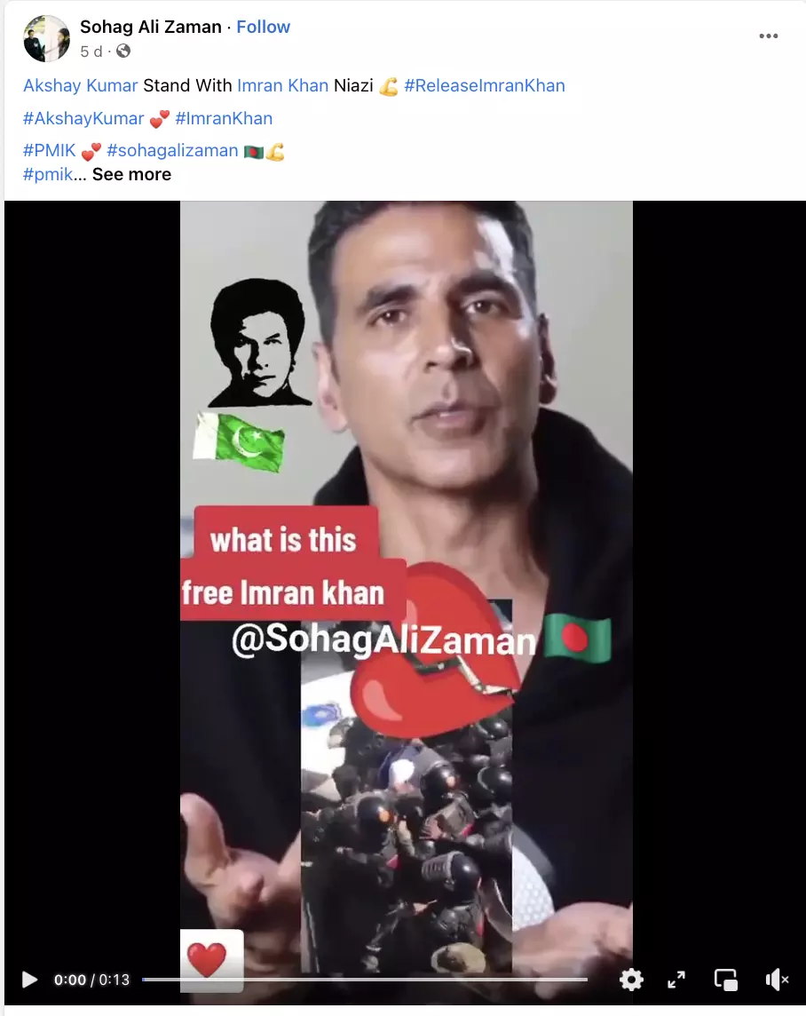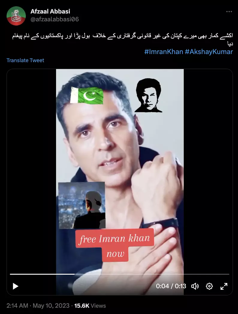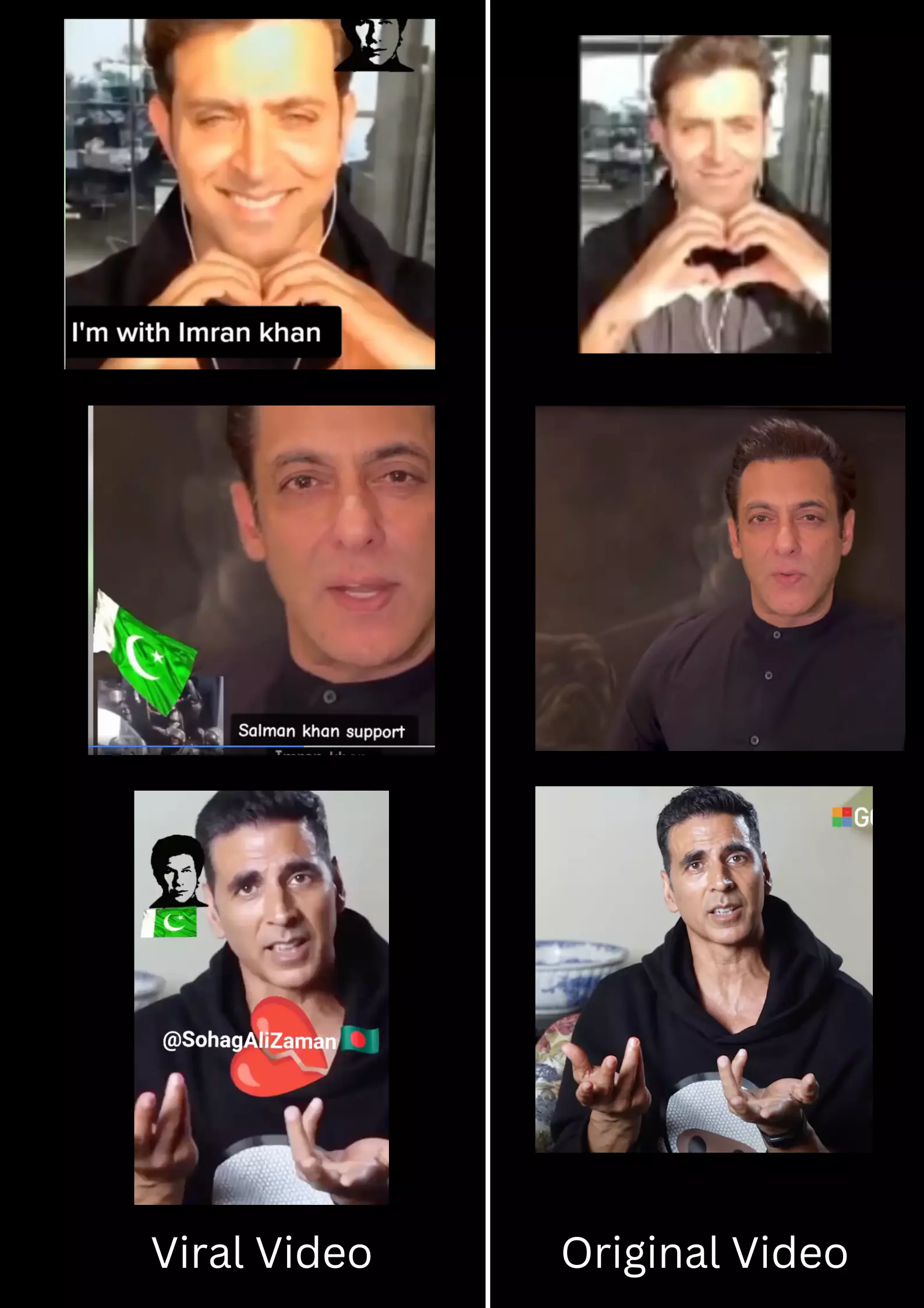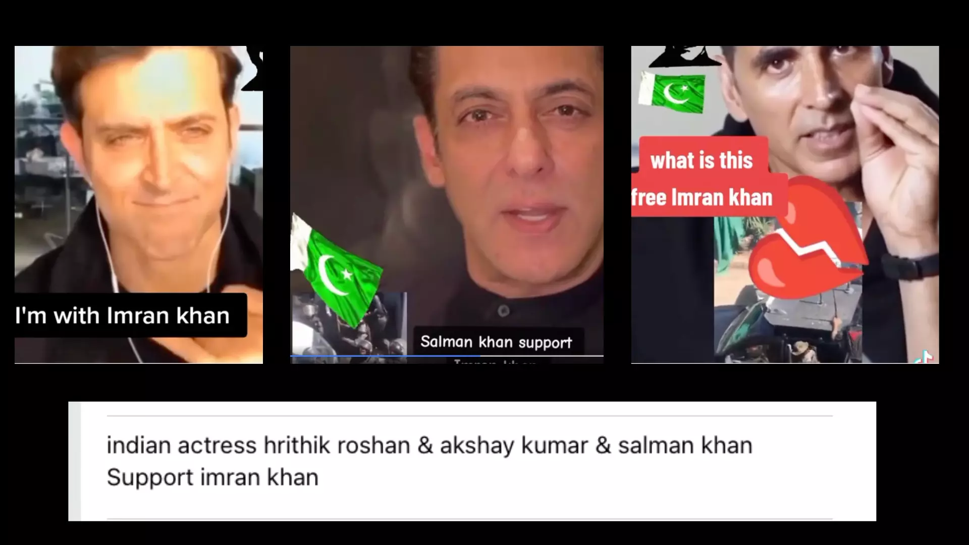 Following his arrest, these doctored videos of the three actors are being shared to claim that they support Khan and have spoken against his unlawful arrest. The video shows the flag of Pakistan in the background while Roshan is heard saying, "For the sake of humanity, speak up for Imran Khan." The videos are being shared with the caption, "indian actress hrithik roshan & akshay kumar & salman khan Support imran khan".