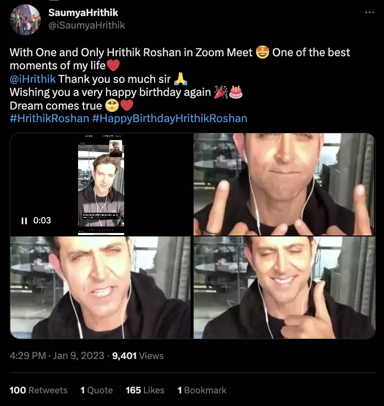 A reverse image search of Hrithik Roshan's clip on Google led us to a tweet by @iSaumyaHrithik who had posted about their interaction with Roshan on a zoom meeting one day before his birthday. The tweet, uploaded on January 9, 2023, had similar visuals of Hrithik from our viral video.