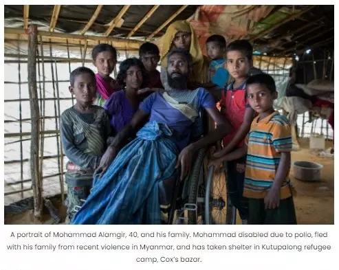 The image has been featured on Dodho, a photography magazine based in Barcelona, Spain. According to the description of the image, "A portrait of Mohammad Alamgir, 40, and his family. Mohammad disabled due to polio, fled with his family from recent violence in Myanmar, and has taken shelter in Kutupalong refugee camp, Cox's Bazar."