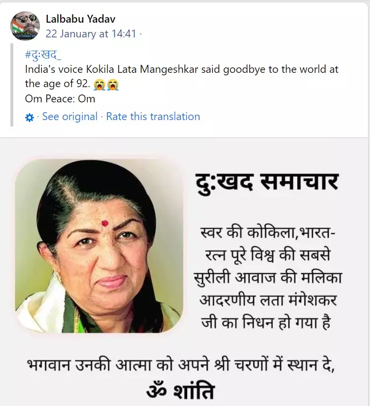 The viral posts in Hindi have a photo of the singer with various captions all claiming that she died at the age of 92. Most captions say, "Lata Mangeshkar has died in Mumbai. Om Shanti"