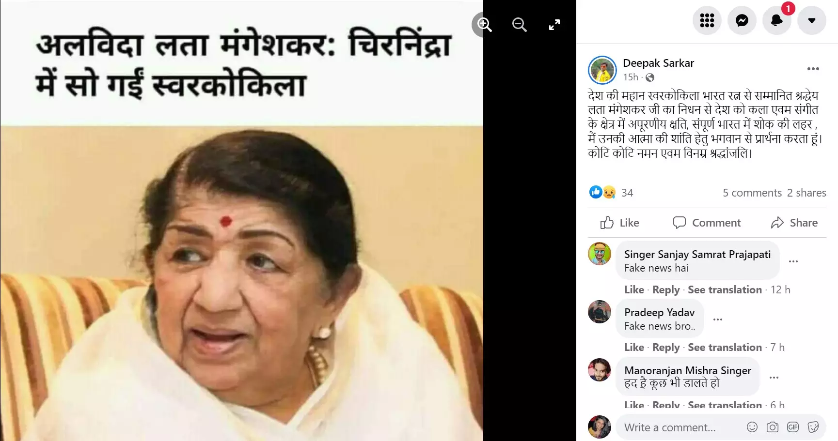 We also found a tweet from Mangeshkar's official handle when her spokesperson on January 22, had tweeted asking people to not pay heed to false speculations about her health conditions.