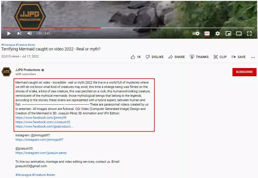 The description further stated that the CGI video design and creation of the mermaid in 3D was done by Joaquin Perez and the 3D animation and VFX edition was done by Jimmy Perez.