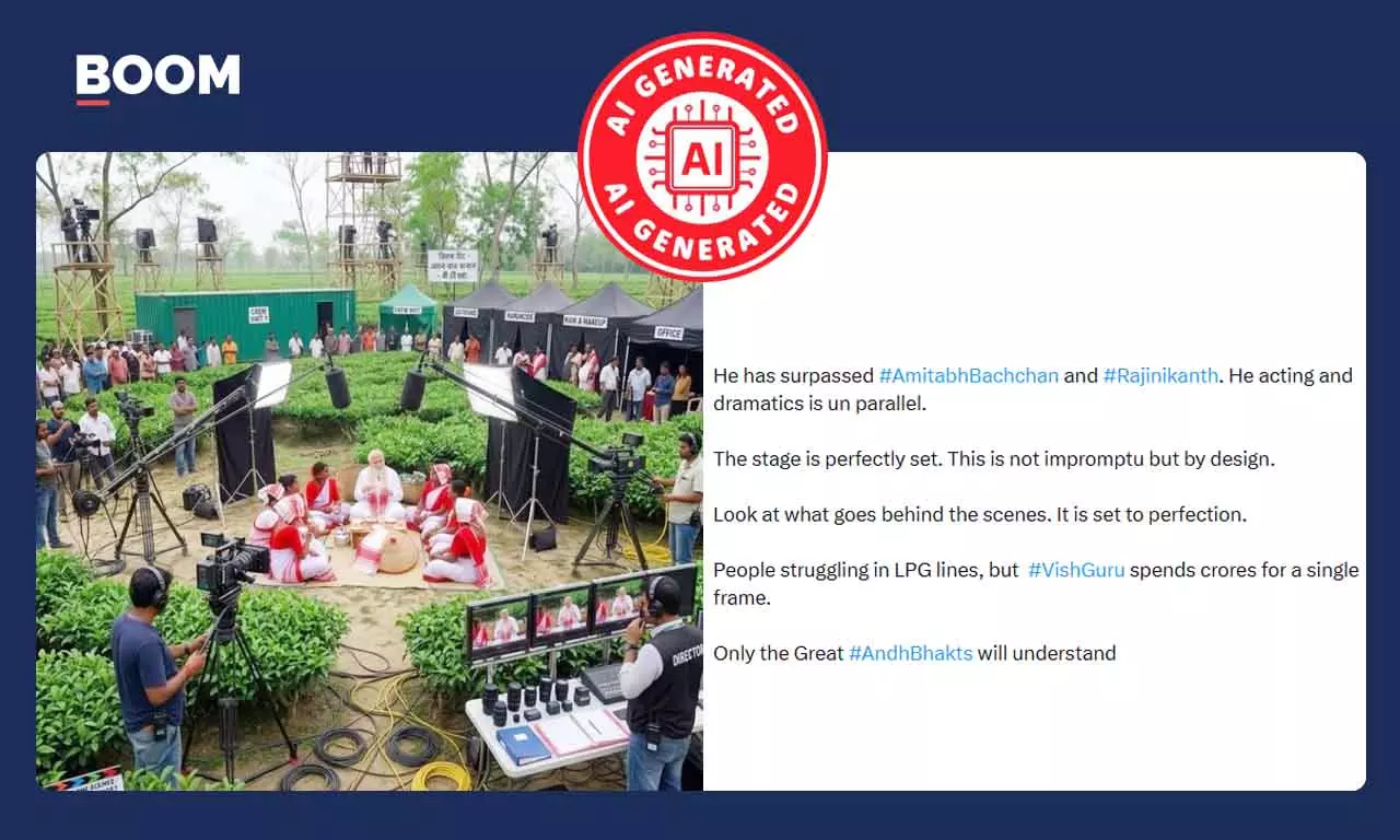 The image of Modi in the tea garden contains tell-tale signs of AI generation. Text on the clapperboard and signage in the image appears as garbled, nonsensical characters, a hallmark of AI-generated imagery. The people surrounding the setup also appear artificially rendered and blurred.