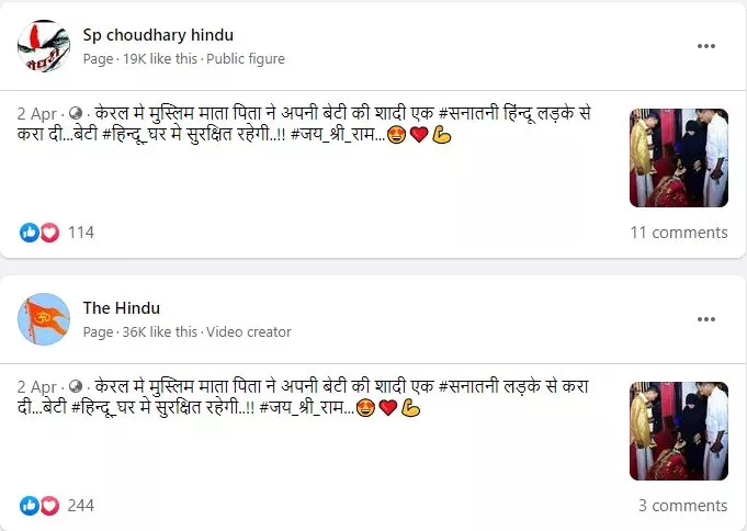 The photograph has been shared with a Hindi caption translating to 'Muslim parents in Kerala got their daughter married to a #Sanatani boy... Daughter will be safe in #Hindu_ home'.