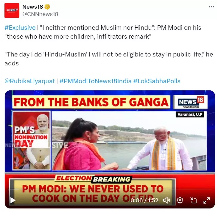 After filing his nomination in Uttar Pradesh's Varanasi constituency, Modi gave an interview to Rubika Liyaquat for News18, during which she asks, "When you referred to Muslims on stage, what was the need to say 'infiltrators' and 'those who reproduce more children'?"