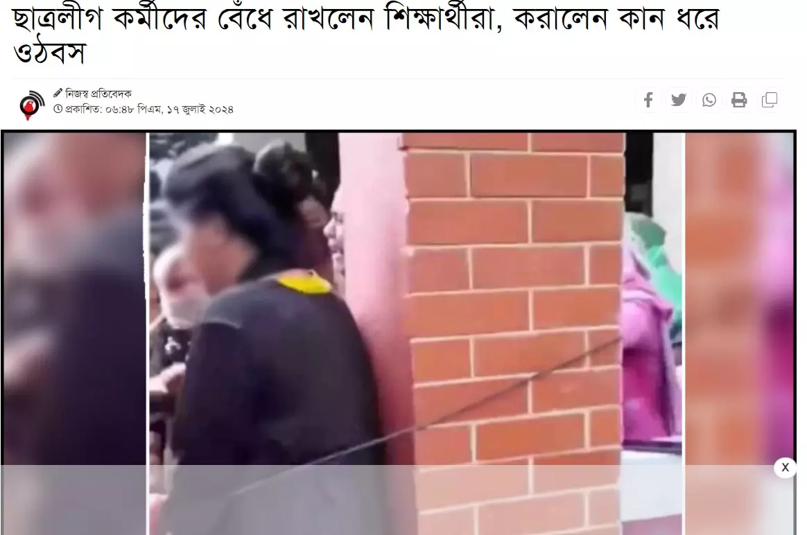 A report by Bangla news portal JagoNews24 carried a screengrab from the same viral video with the story title translating in Englist to, "The students tied the BCL workers, made them sit by their ears"