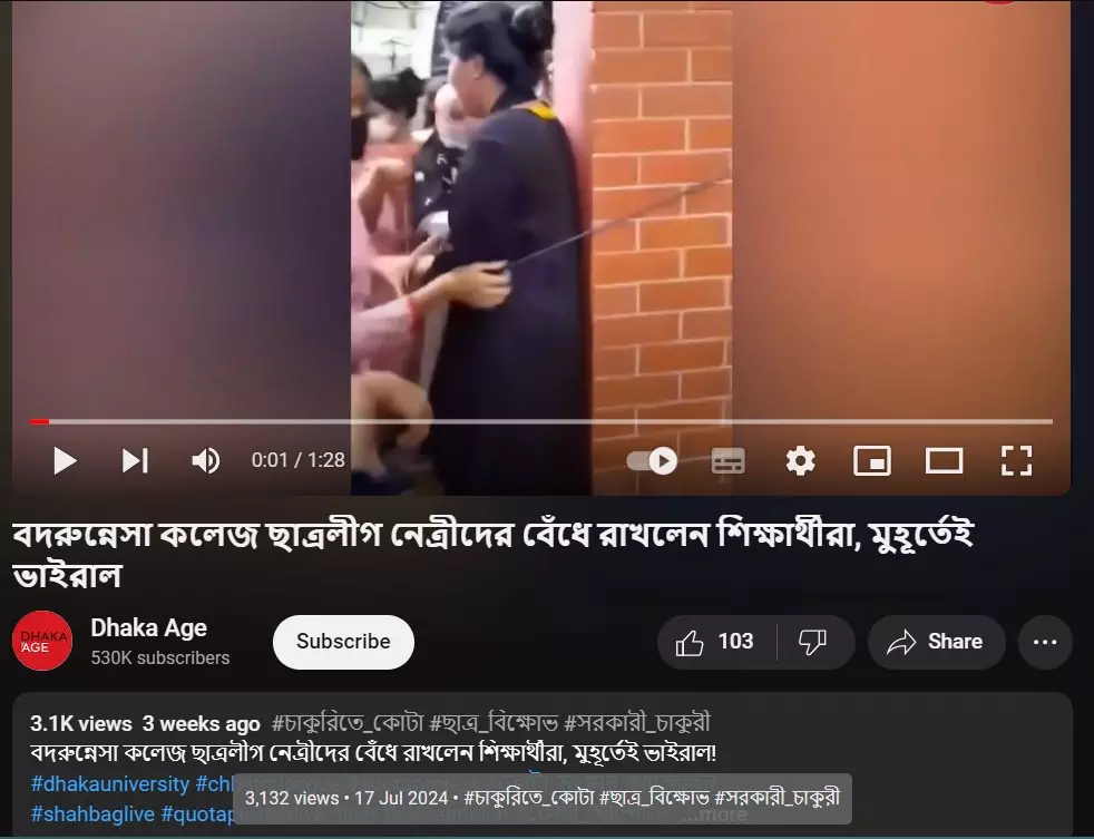 We first ran a reverse image search on a keyframe from the video and found several news stories dated July 17, 2024 stating that it shows students of the Begum Badrunnessa Government Women's College in Dhaka tying up fellow students who were also members of the Bangladesh Chhatra League.