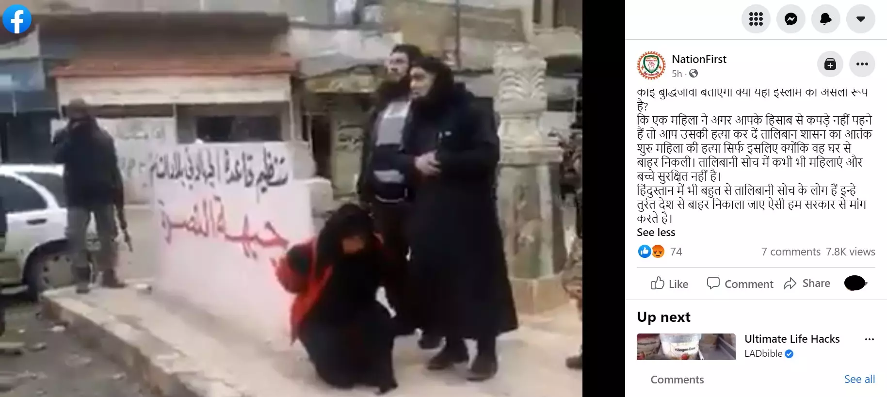 The video is being shared with a caption in Hindi that translates to, "Will an intellectual tell us if this the real form of Islam? That if a woman is not dressed according to you, then you kill her, the terror of the Taliban regime started, killing the woman just because she came out of the house. Women and children are never safe in Taliban thinking. There are many people of Talibani thinking in India too, we demand from the government that they should be thrown out of the country immediately."