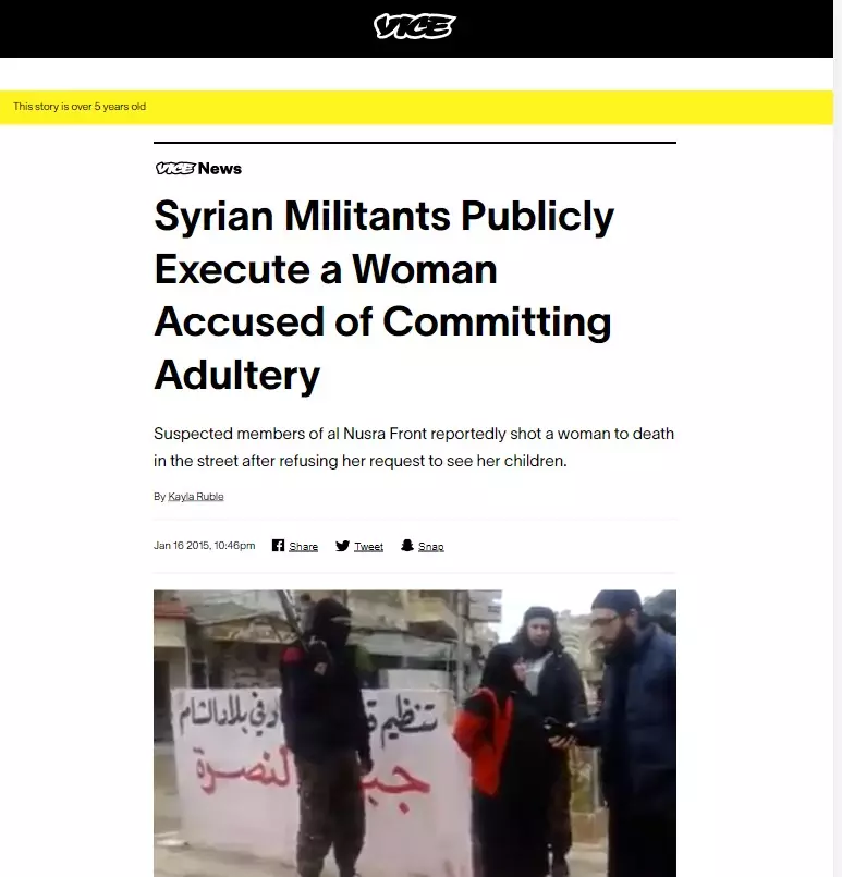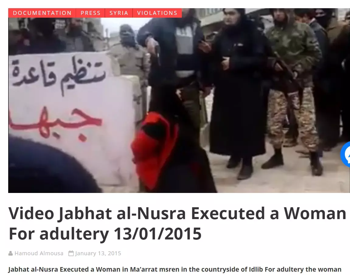 The report by 'Raqqa is being Slaughtered Silently' was dated January 13, 2015 and claimed that the video showed al-Nusra, the Syrian wing of terrorist group al Qaeda, publicly executing a woman accused of adultery in the al-Ma'arra region near Idlib in the country.