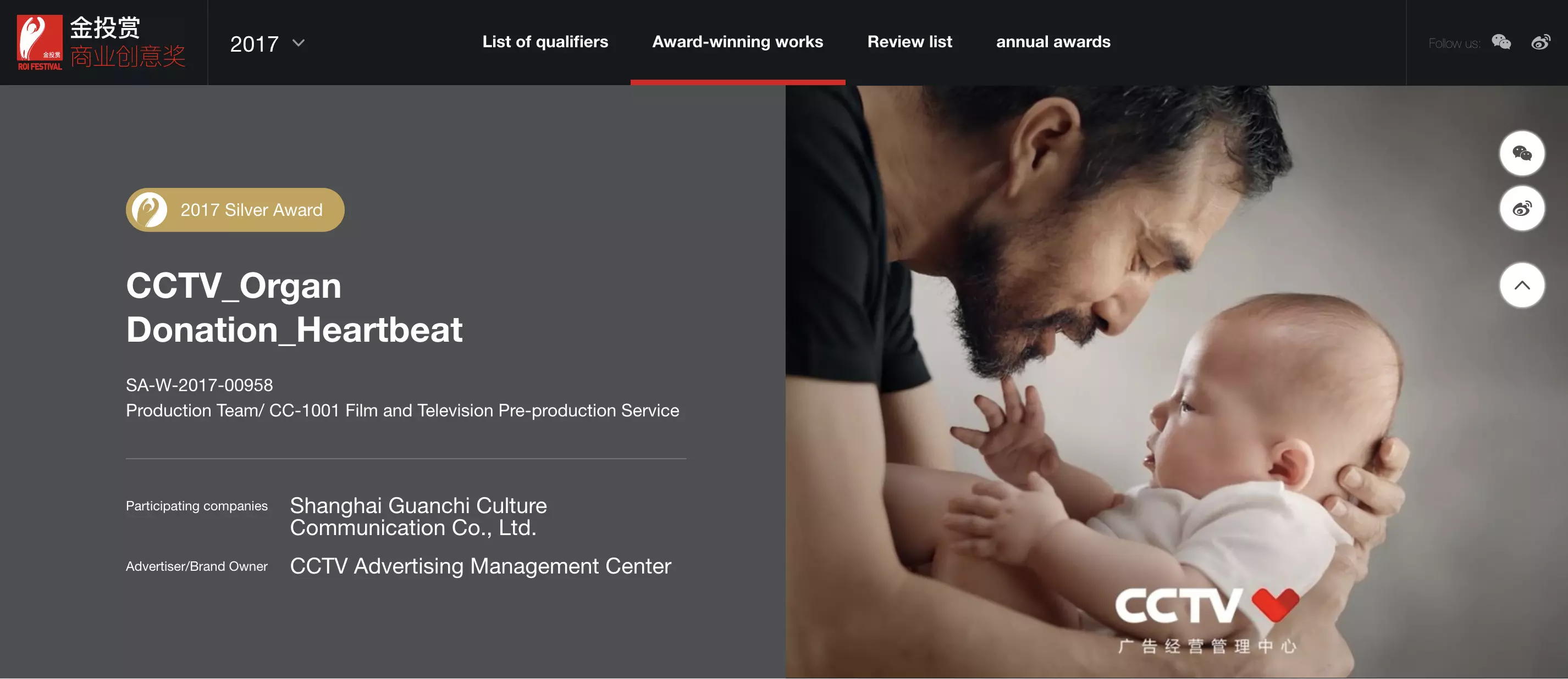 Further description of the commercial explains that it is advertised by CCTV Advertising Management Center, and is produced by advertising agency DDB China. "Experts from the Health and Family Planning Commission, the Red Cross Organ Donation Management Center, organ transplant doctors, and organ donation coordinators were invited to participate in the theme planning of this film," it adds.