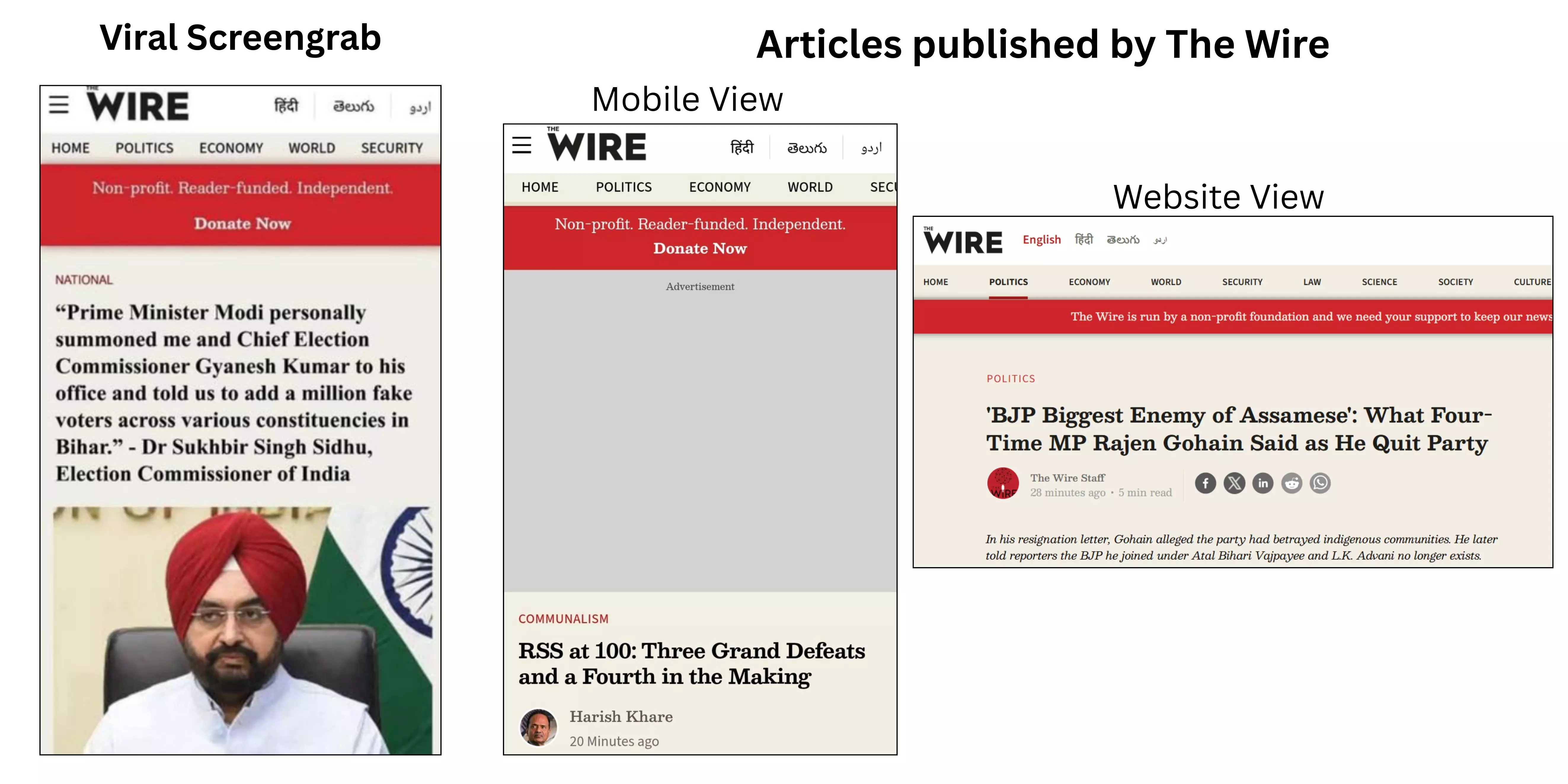 A fake screenshot of an article published on The Wire has surfaced online. The article purports to quote election commissioner of India (ECI) Dr Sukhbir Singh Sandhu as saying that Prime Minister Narendra Modi asked him to add 'a million fake voters across constituencies in Bihar.'