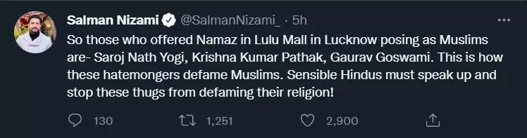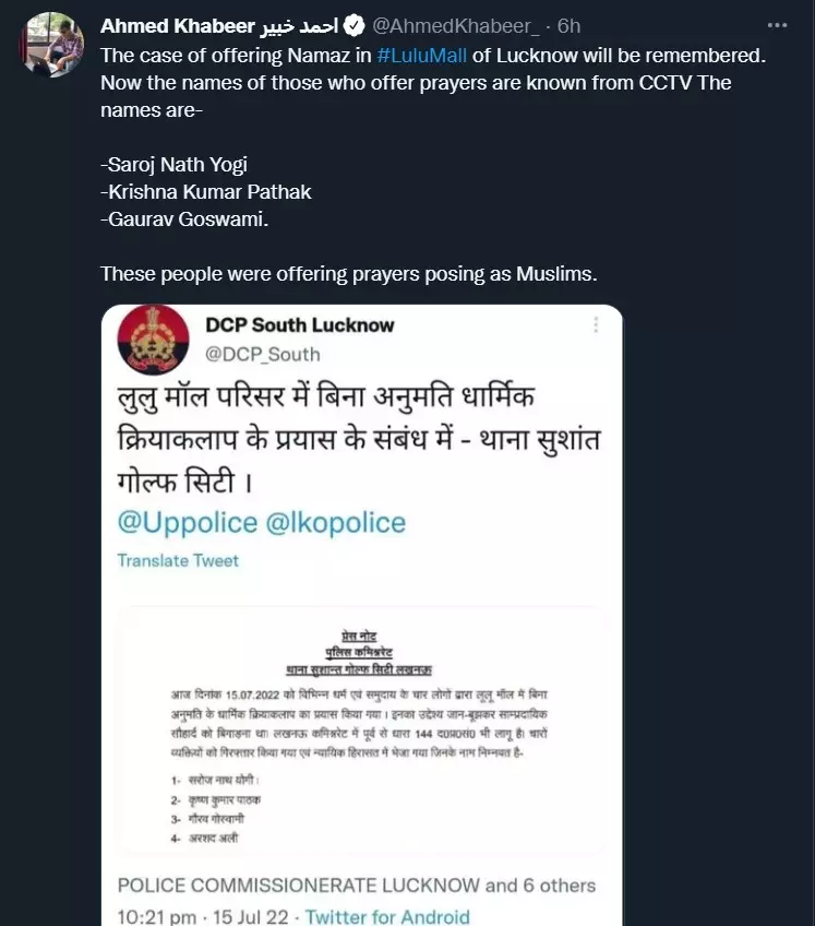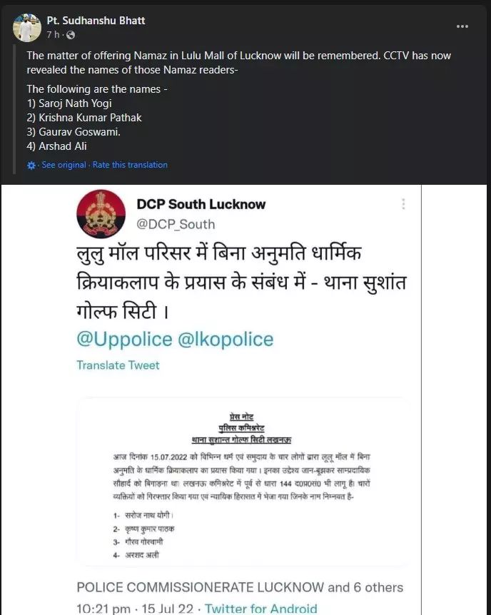 On July 15, 2022, the Twitter handle DCP South Lucknow tweeted a list of 4 names - 3 Hindus and one Muslim accused of trying to perform religious activities at LuLu Mall without permission, who were taken into custody. The names mentioned were - 1) Saroj Nath Yogi 2) Krishna Kumar Pathak 3) Gaurav Goswami 4) Arshad Ali.
