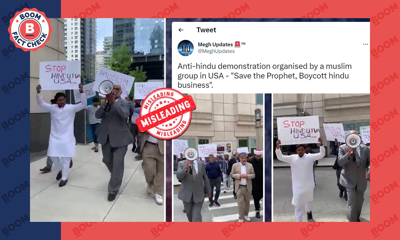The video which shows a group people protesting with placards that read, "Stop Hindutva USA", "Muslim Lives Matter" and chanting "Save the prophet" was tweeted by the Twitter handle '@MeghUpdates' with the caption, "Anti-hindu demonstration organised by a muslim group in USA - "Save the Prophet, Boycott hindu business"."
