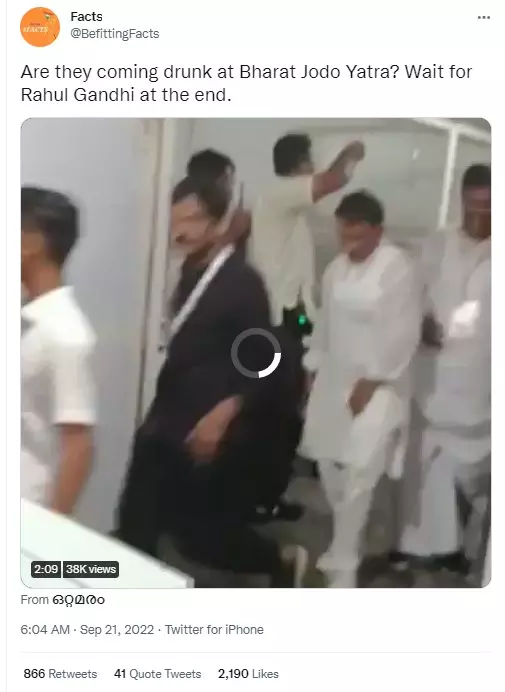 Twitter account @befittingFacts tweeted the video with the caption, "Are they coming drunk at Bharat Jodo Yatra? Wait for Rahul Gandhi at the end."